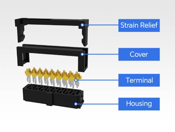 IDC W/T 應(yīng)力消除裝置,其中應(yīng)力消除蓋可消除應(yīng)力,防止電纜因振動(dòng)或外部拉動(dòng)而松動(dòng),并增強(qiáng)公頭和母端配接期間的機(jī)械穩(wěn)定性。